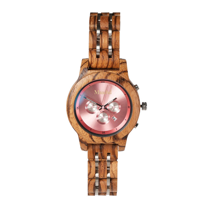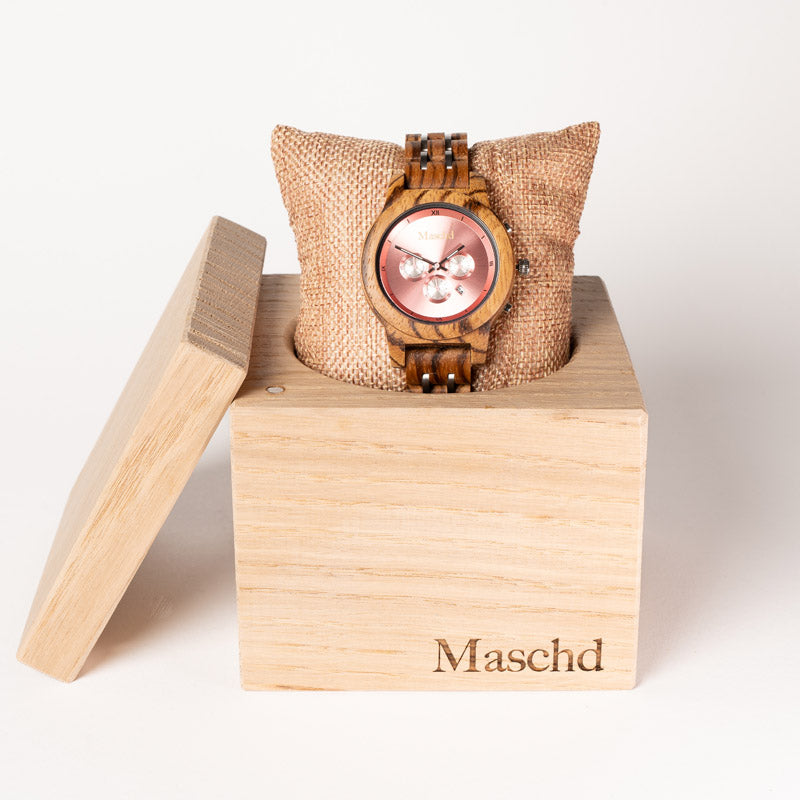 Natürlichkeit trifft moderne Chronographen-Optik: Ein fein verarbeitetes Holzgehäuse, ein leichtes Armband aus Metall & Holz und ein zuverlässiges Sunon Quarzwerk. Elegant am Handgelenk, angenehm im Alltag – ein Statement in warmen Holztönen.