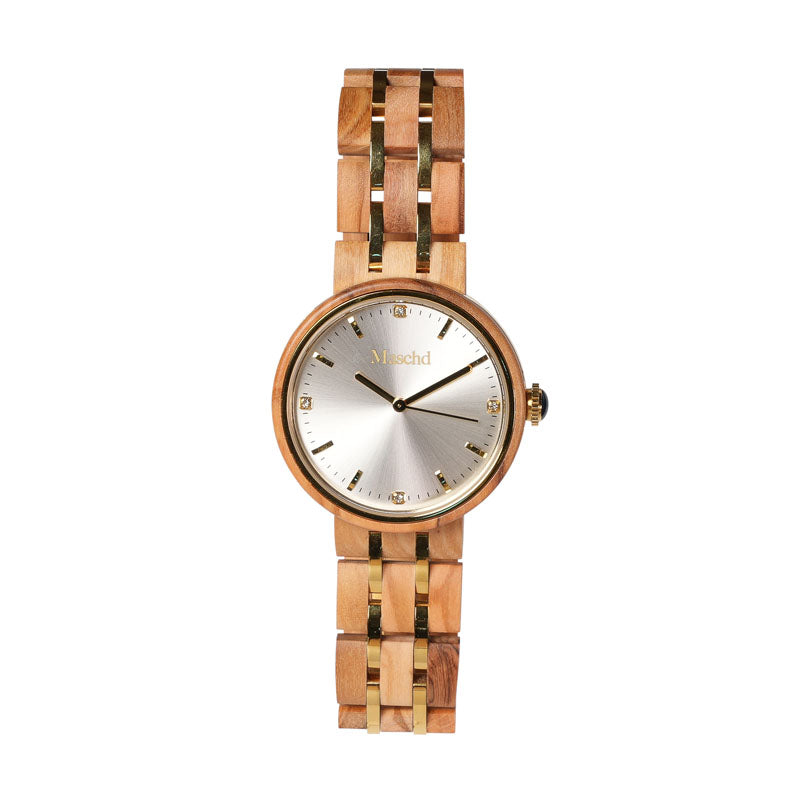 Frauen Holzuhr aus Olivenholz mit Silbenrne ziffernblatt und Goldenene Akzenten