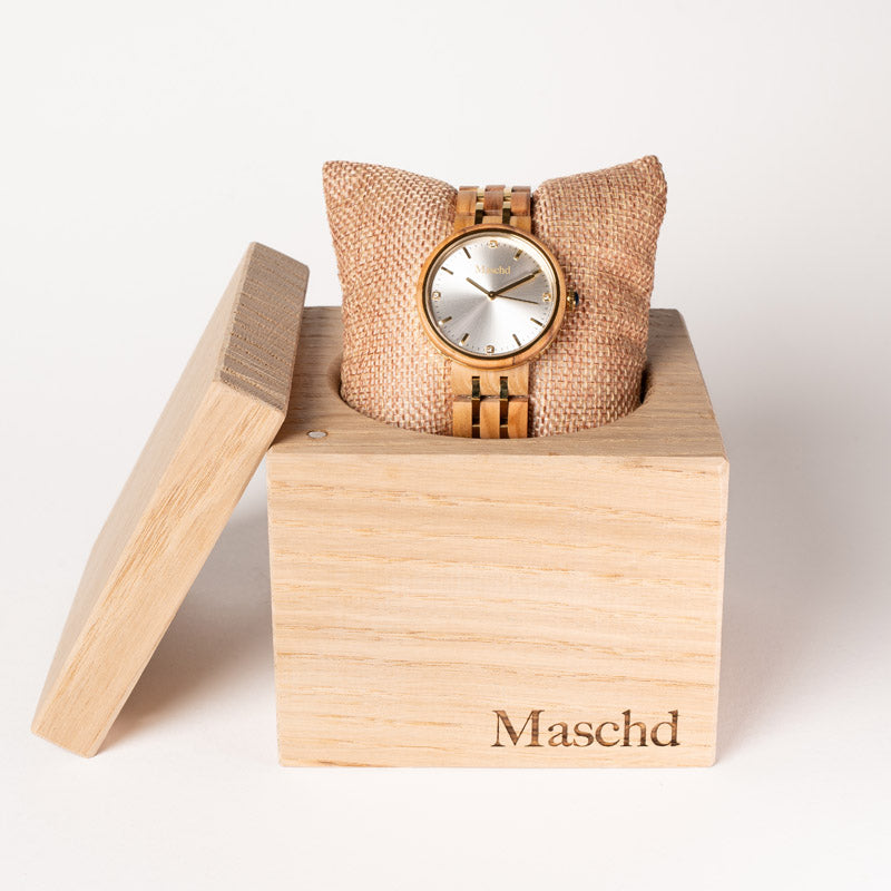 Elegante Damen Holzuhr aus Olivenholz in der Passenden Eichenbox Verpackung