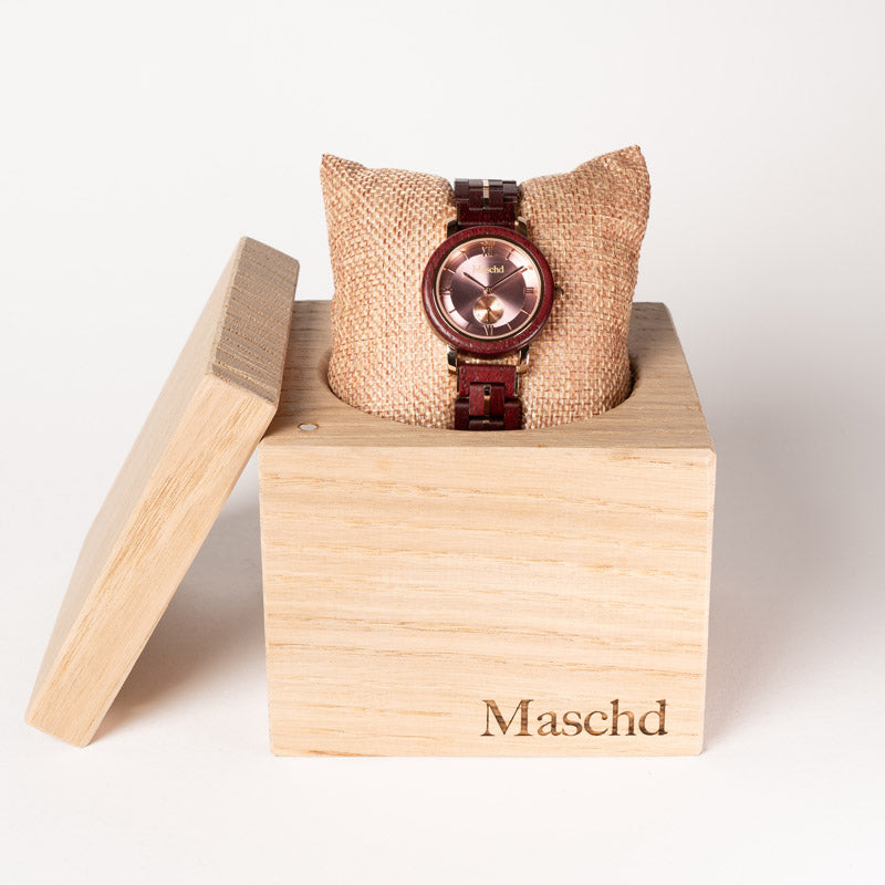 Damen Holzuhr aus Purpurholz in einer Verpackung aus Eichenholz Würfel