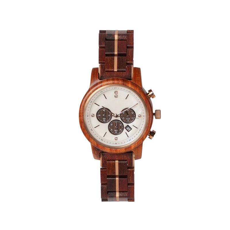 Elegant, natürlich und präzise: Die Red Sandalwood Chronograph vereint feines Rotes Sandelholz mit glänzenden Edelstahlakzenten zu einem zeitlosen Schmuckstück. Das schneeweiße Zifferblatt mit goldenen Details und die feine Verarbeitung machen sie zur idealen Uhr für Frauen, die Natürlichkeit und Stilbewusstsein verbinden möchten.