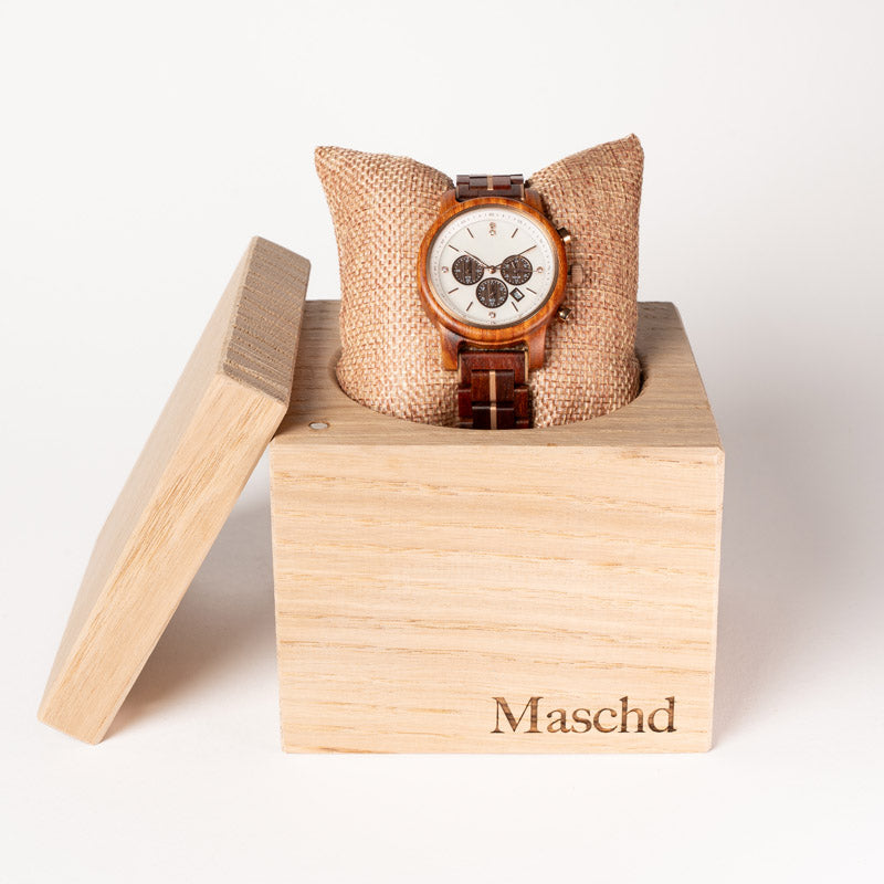 Holzuhr für Frauen aus Rotem Sandelholz in einer Eichenbox verpackung