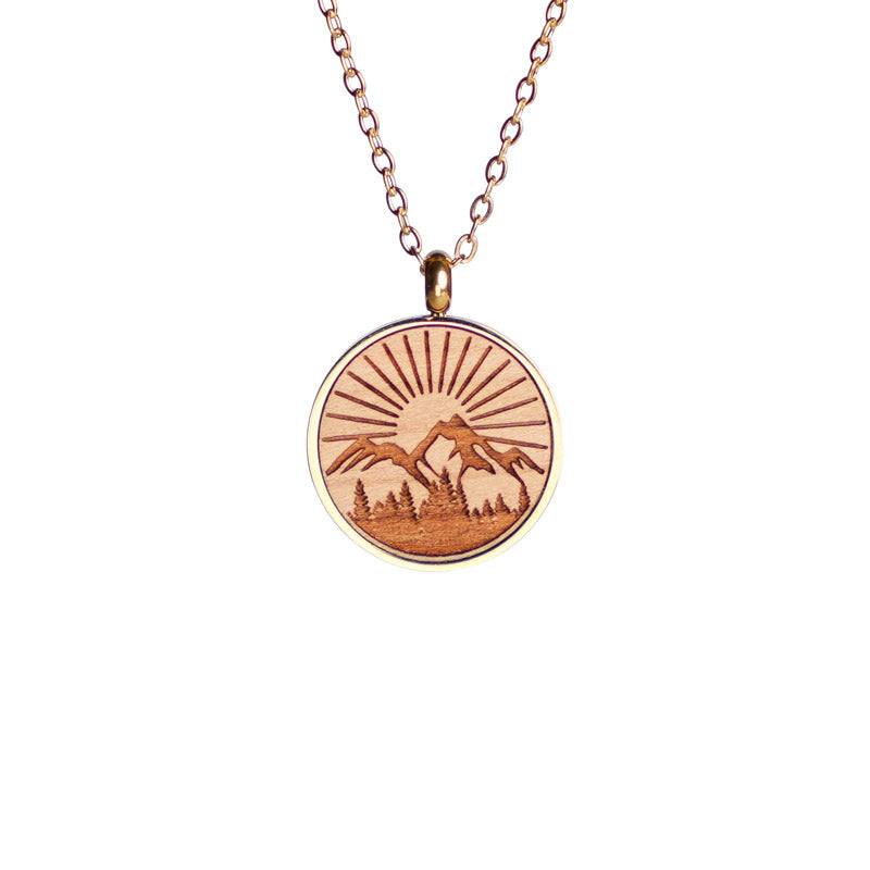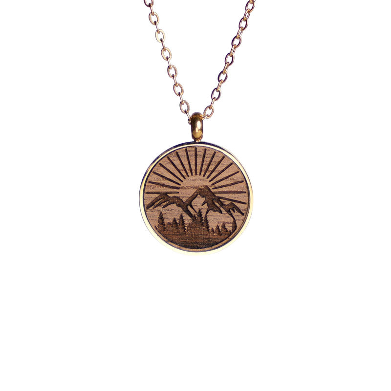 Holz Halskette aus Nussbaum mit Berg Motiv und Sonne