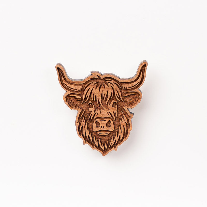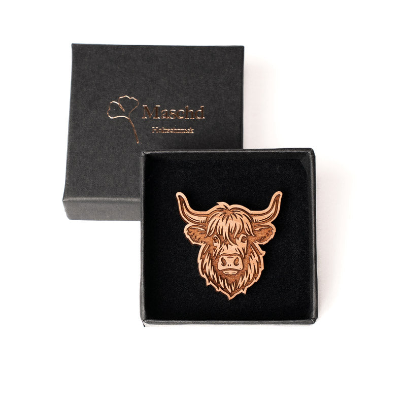 Sicher Dir Deinen einzigartigen Hochlandrind Anstecker aus edlem Kirschholz. Unsere Holzpins geben deinem Trachten Outfit den letzten Schliff. Sie passen perfekt zur Weste, Trachtenhut und zum Dirndl. Mit ihr sind Dir beim nächsten Fest neugierige Blicke garantiert.