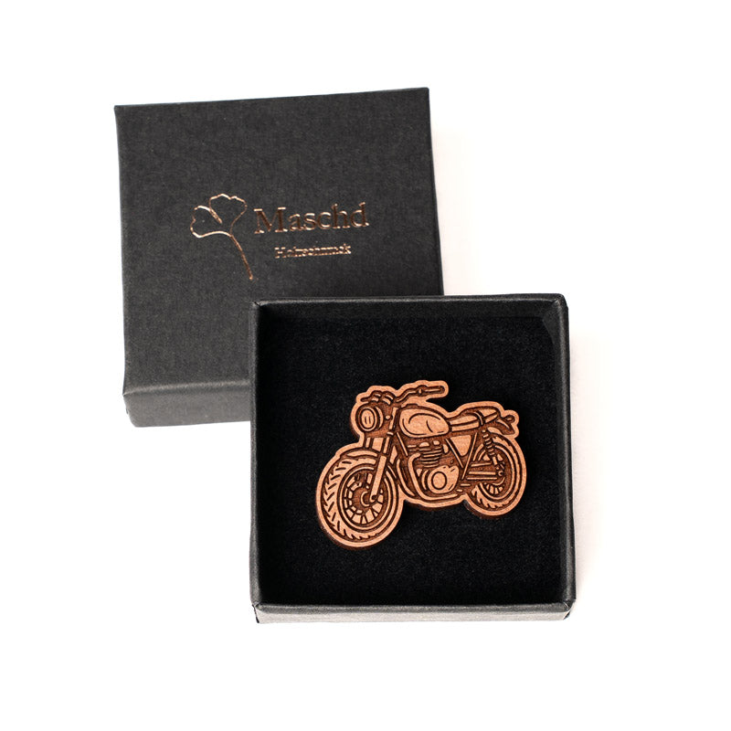 Sicher Dir Deinen einzigartigen Motorrad Anstecker aus edlem Kirschholz. Unsere Holzpins geben deinem Trachten Outfit den letzten Schliff. Sie passen perfekt zur Weste, Trachtenhut und zum Dirndl. Mit ihr sind Dir beim nächsten Fest neugierige Blicke garantiert.