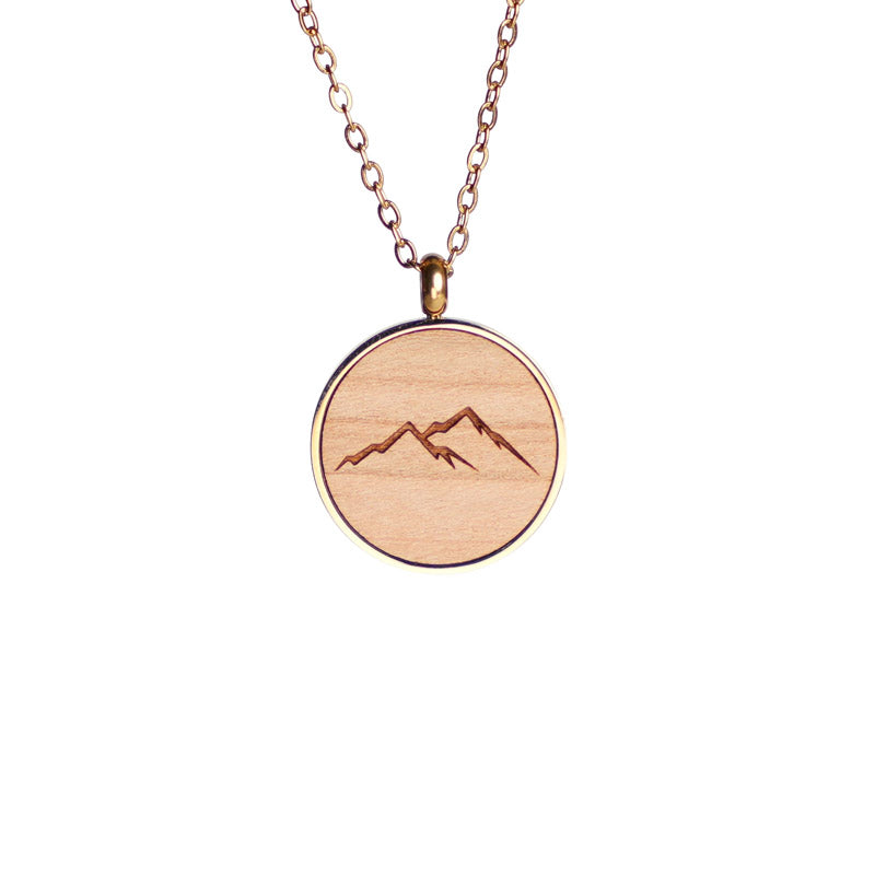 Bergmotiv graviert auf Kirschbaumholz – handgefertigte Edelstahl-Halskette für Naturliebhaber